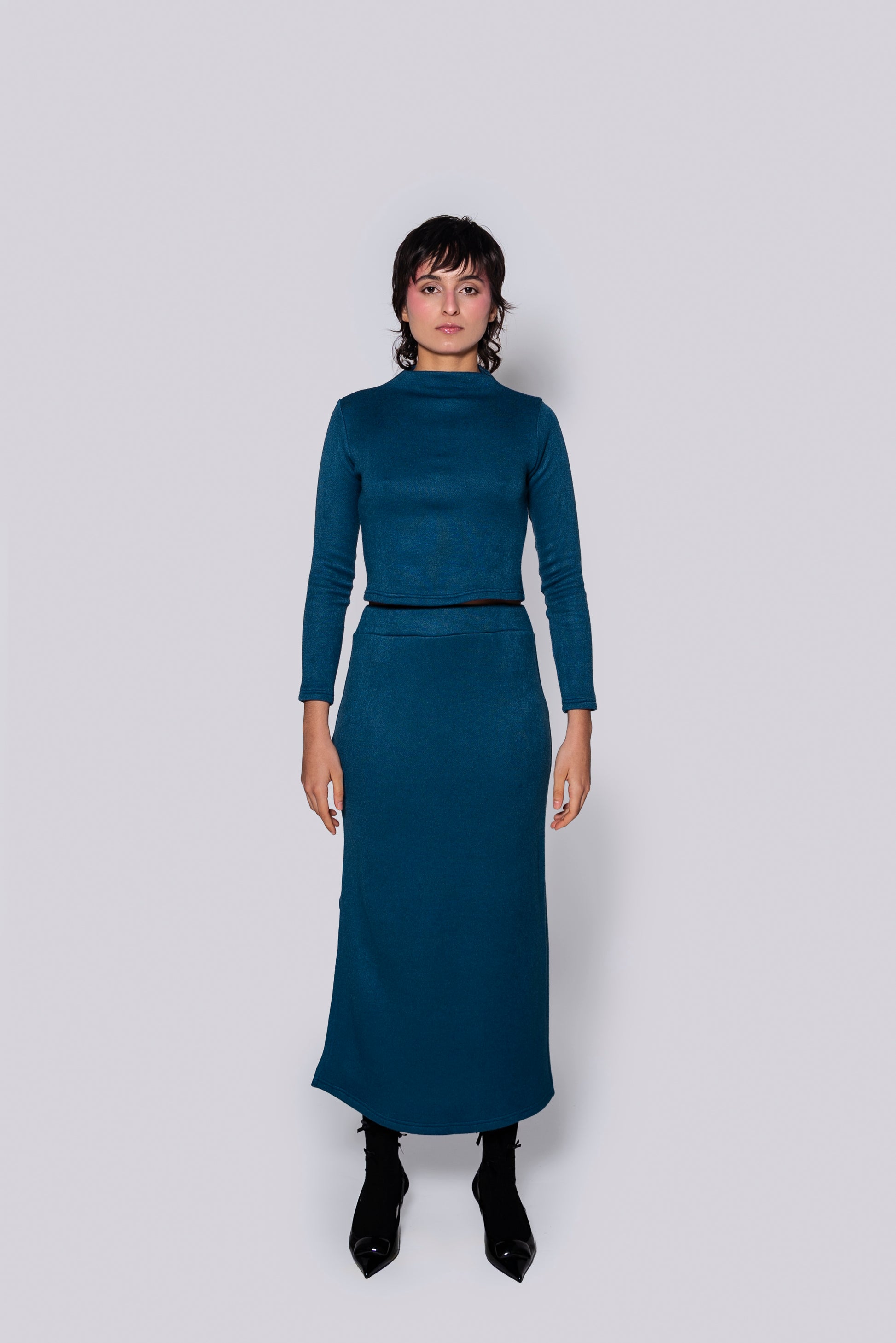 Camiseta corta de punto con cuello semi alto y silueta ajustada. Su diseño minimalista realza la figura y aporta un aire contemporáneo y versátil, ideal para combinar con prendas de tiro alto o para superponer bajo chaquetas y americanas.