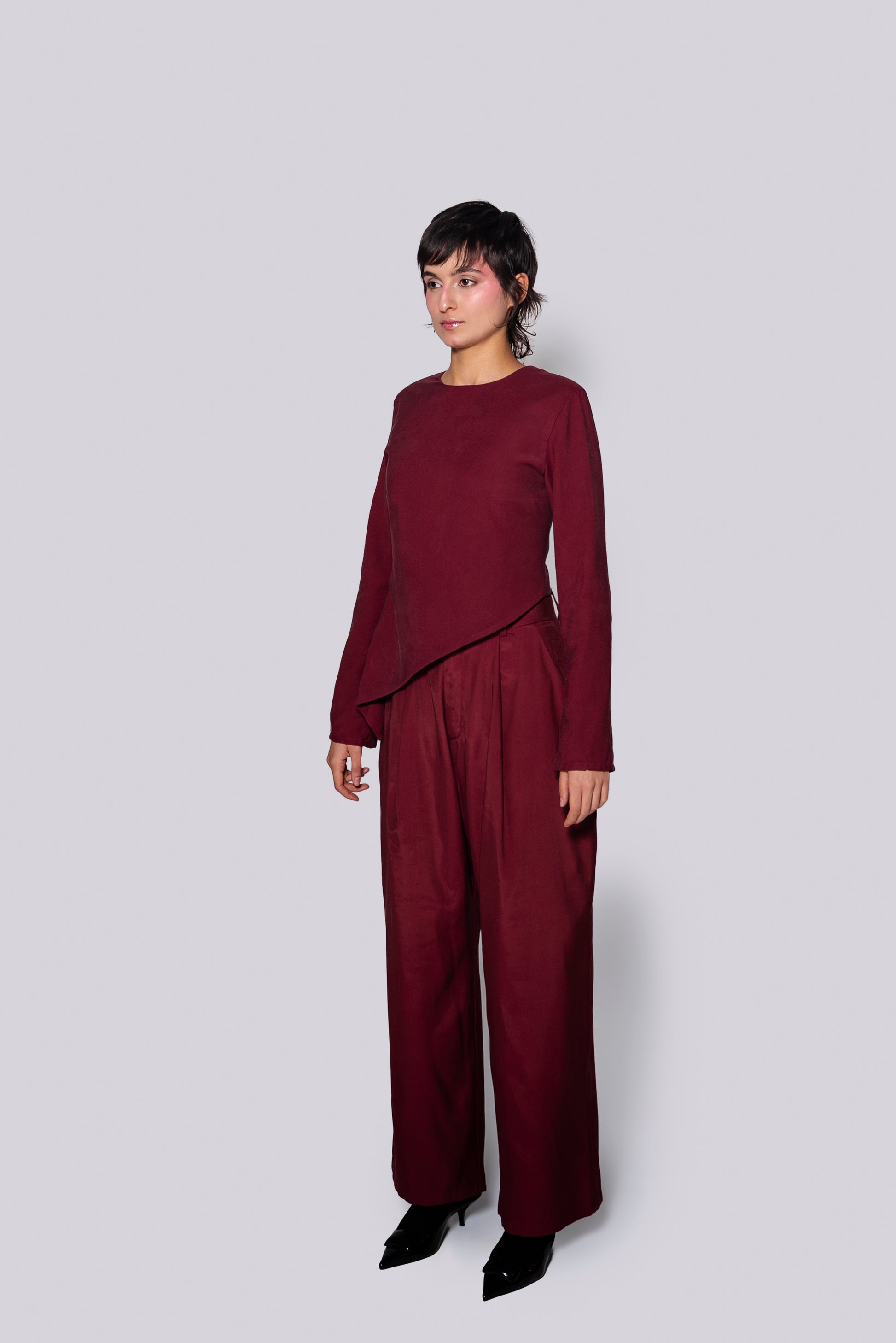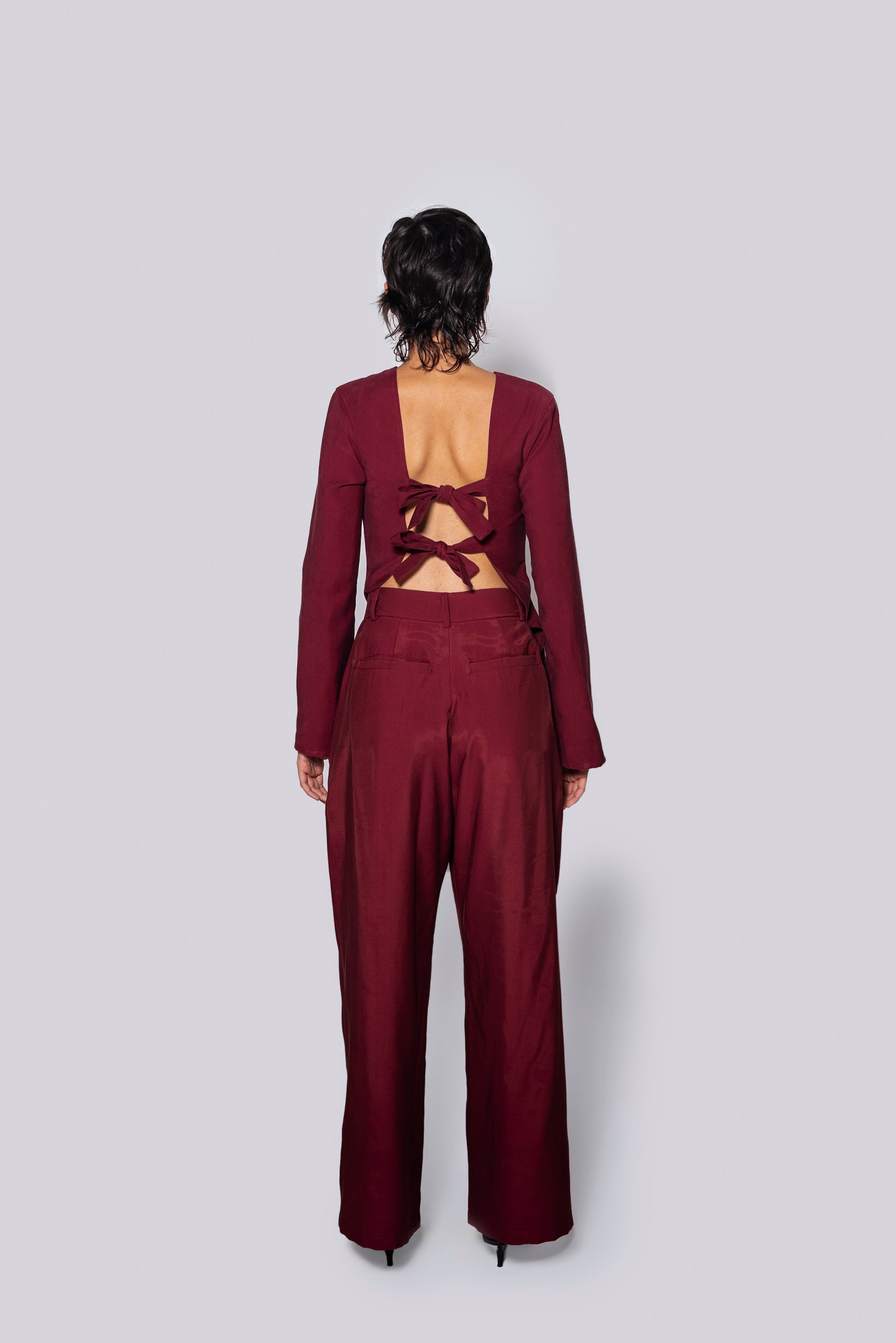 Top de Tencel con manga larga y diseño asimétrico en el borde inferior, que le da un toque moderno y único. La parte posterior cuenta con dos cintas que se atan en la espalda formando lazos, lo que permite ajustar el top a la perfección y añade un detalle femenino y elegante.