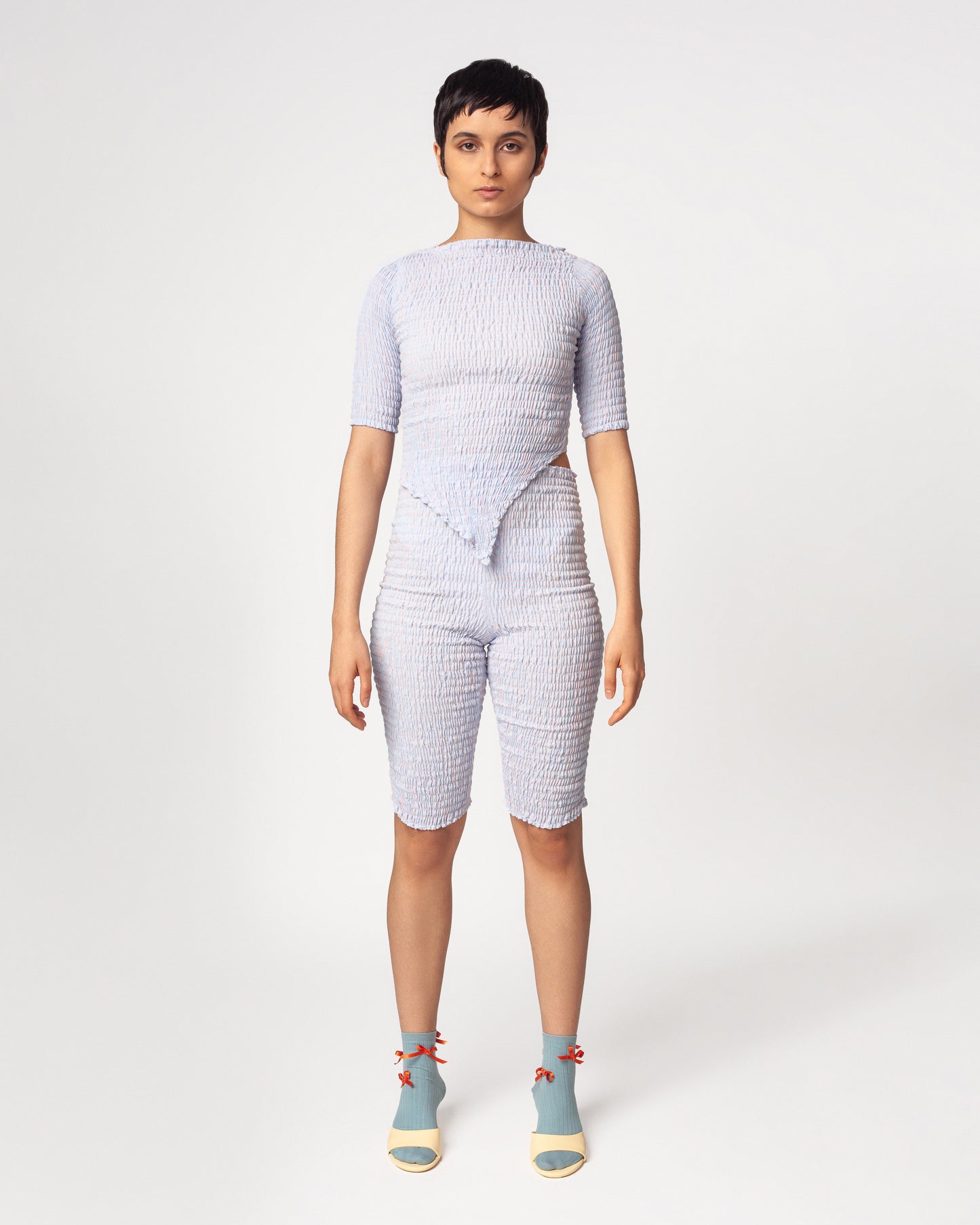 Top único y especial de popelín azul celeste, adornado con un estampado de cuadros naranjas y completamente fruncido en estilo nido de abeja. Destaca por su escote barco, un delicado detalle de pico en el bajo delantero y mangas que caen justo por encima del codo.