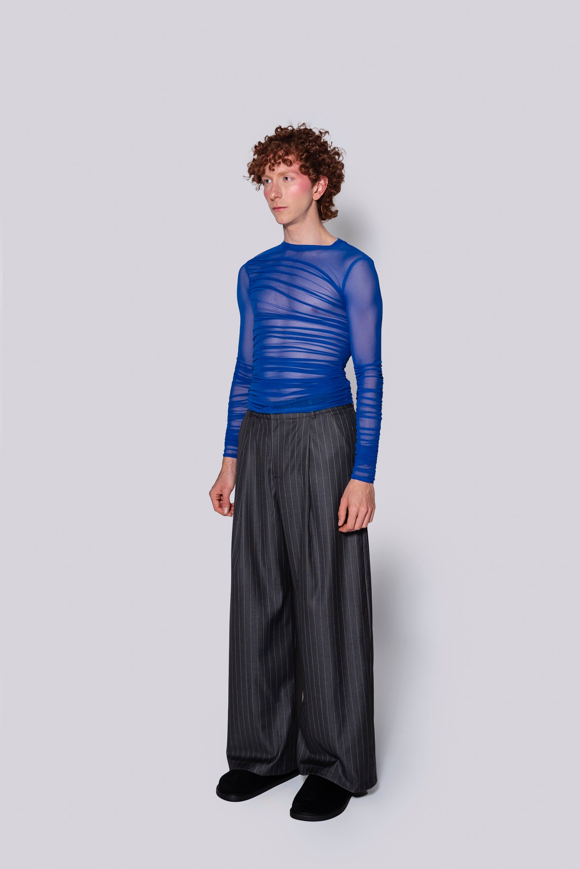 Top de tul semitransparente con frunces suaves que crean un efecto drapeado en el cuerpo. Su silueta se ajusta delicadamente y cae hasta la cadera, aportando textura, movimiento y un toque sofisticado a cualquier look.