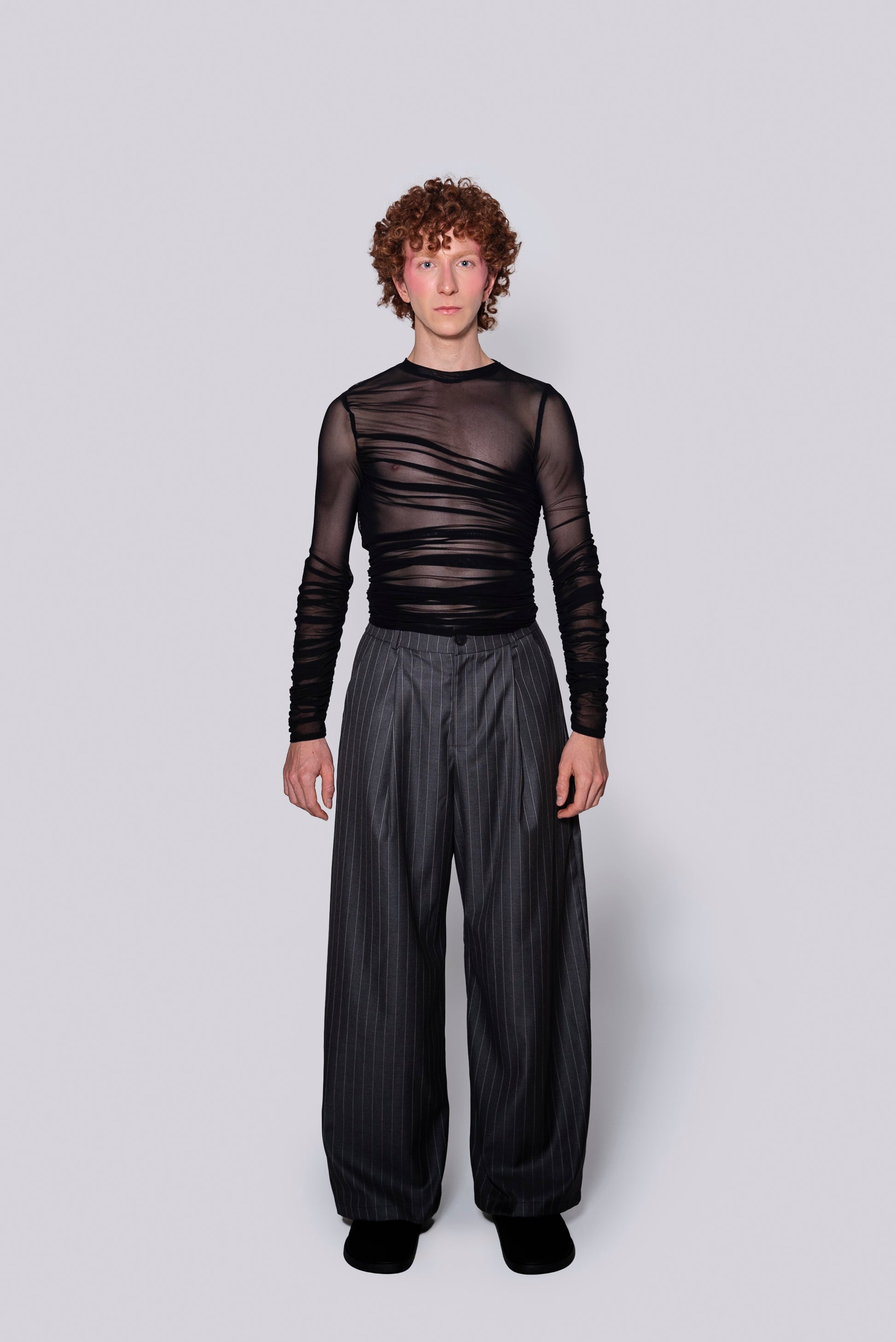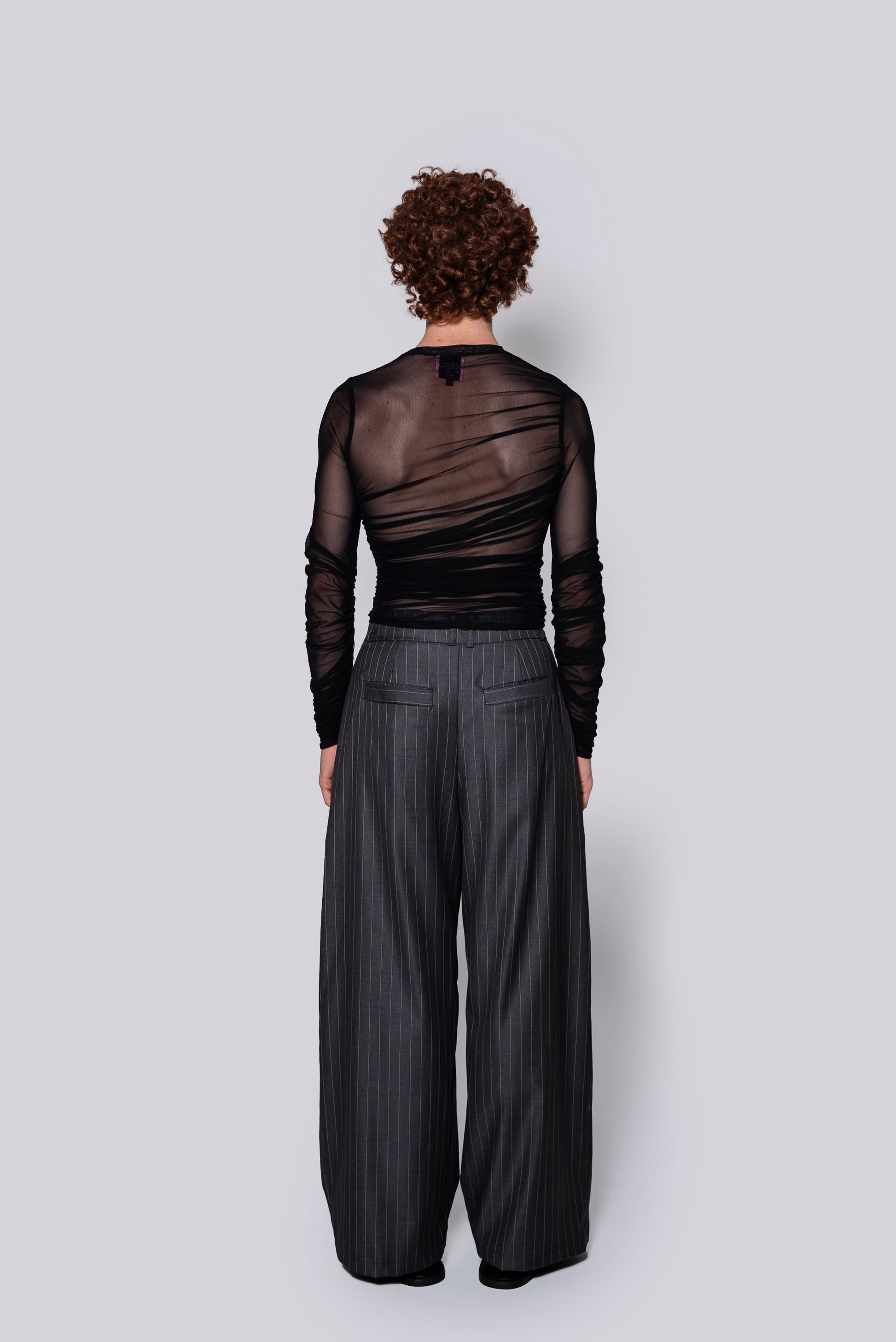 Top de tul semitransparente con frunces suaves que crean un efecto drapeado en el cuerpo. Su silueta se ajusta delicadamente y cae hasta la cadera, aportando textura, movimiento y un toque sofisticado a cualquier look.